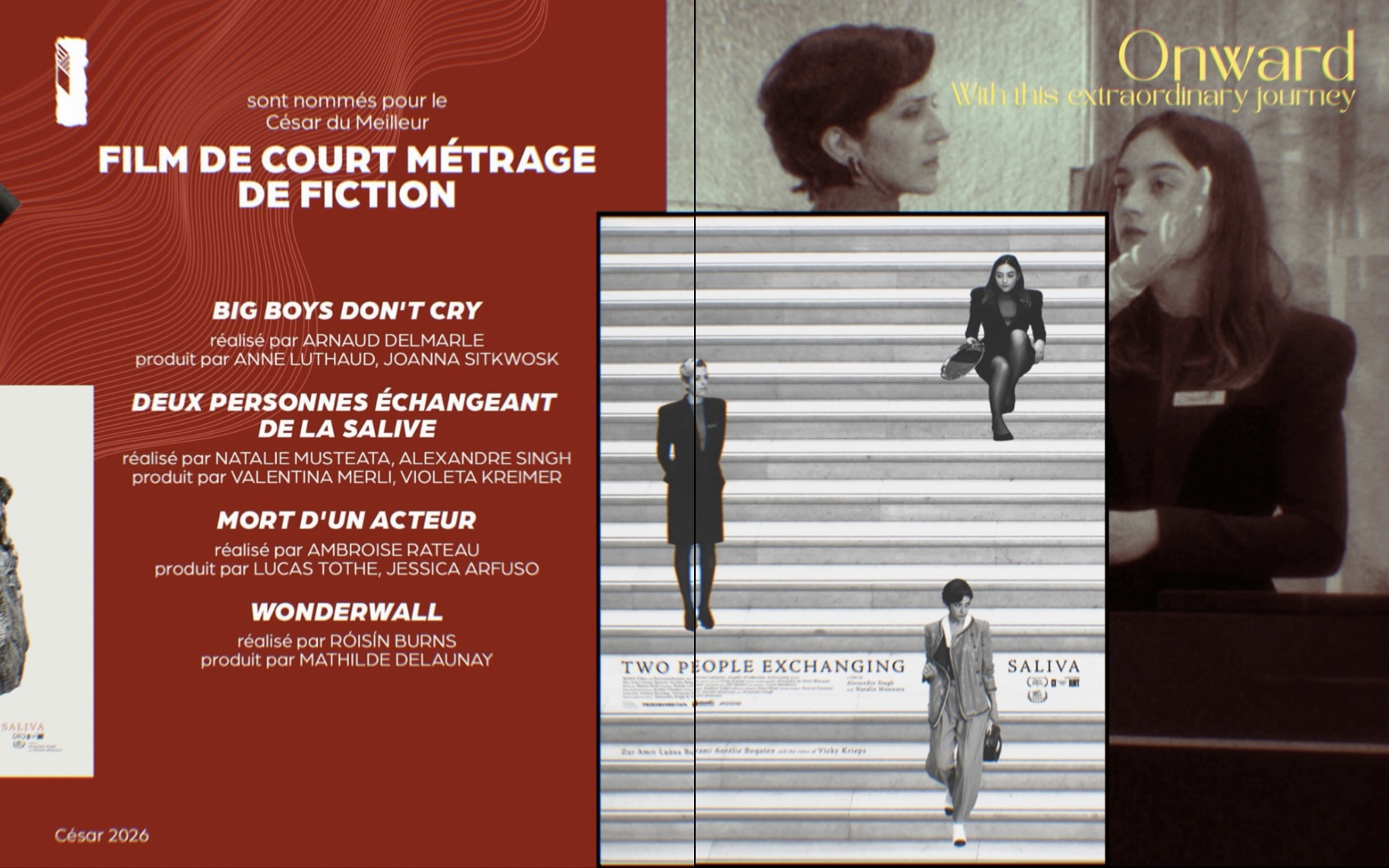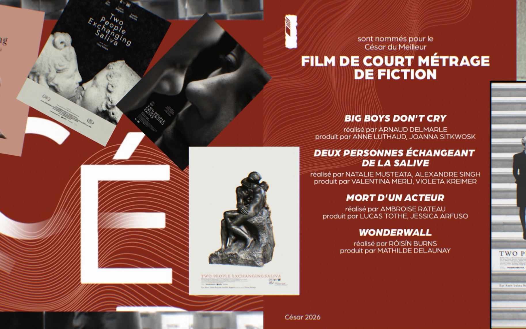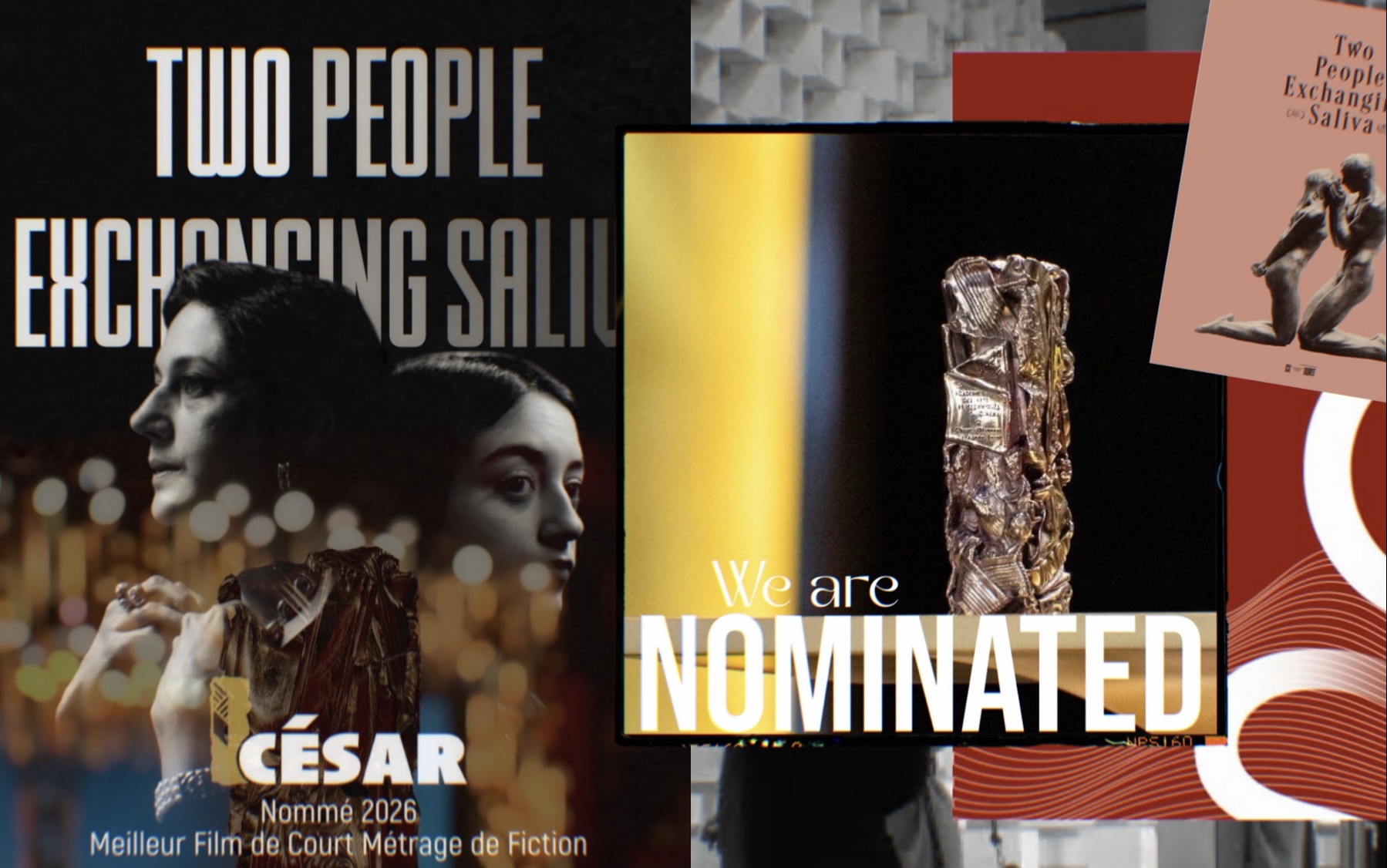 Paris, February 2026 — Two People Exchanging Saliva, directed by Alexandre Singh and Natalie Musteata, is nominated for the César 2026 for Best Fiction Short Film.
